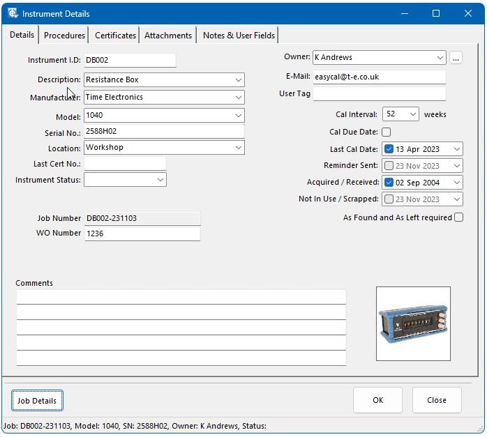 The user has the option to include additional custom information. 4 sets of data fields are available. The user can allocate a title (name) to them. There is a maximum of 5 records in each set – Text (free form text, 20 char max), Date, Flag and Number. If the field name is left blank, this field will not appear on the instrument information ‘User Data window. The user will find these custom fields particularly useful for including features that are not included as standard in EasyCal e.g. calibration time costing or specific designations e.g. ‘hire’ or ‘loaned’. The user can add these fields to certificates or reports by using Crystal Reports. Alternatively a completely new report can be designed.